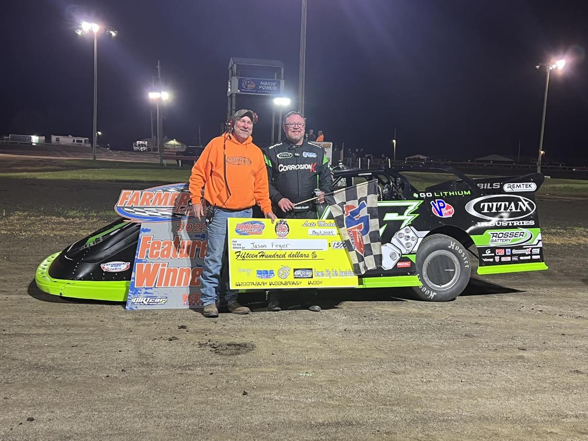 The following night at Fairbury Speedway’s season opener, Feger took a more methodical route to the front. After finishing second in his heat to secure a spot in the FALS Cup feature, he steadily worked his way through the field. Amid a fierce battle up front, Feger tracked down Jake Little on lap 20 and led the final 10 circuits to secure his second win in as many nights.